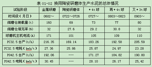 總之,¢4.2×13m聯(lián)合粉磨系統(tǒng)、水泥磨二倉改用陶瓷研磨體,進行的PC 32.5和PO 42.5水泥生產試驗,盡管是初步試驗,盡管臺時產量有所下降,已經取得了明顯的節(jié)電效果,初步試驗的總體情況見表01-02。