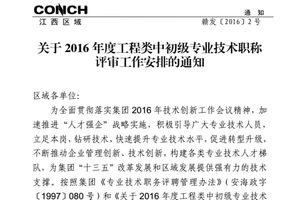 為全面貫徹落實(shí)集團(tuán)2016年技術(shù)創(chuàng)新工作會議精神,加速推進(jìn)“人才強(qiáng)企”戰(zhàn)略實(shí)施,積極引導(dǎo)廣大專業(yè)技術(shù)人員,立足本崗,鉆研技術(shù),快速提升專業(yè)技術(shù)水平,促進(jìn)轉(zhuǎn)型升級,不斷推動企業(yè)管理創(chuàng)新、技術(shù)創(chuàng)新,構(gòu)建各類專業(yè)技術(shù)人才梯隊(duì),為集團(tuán)“十三五”改革發(fā)展和區(qū)域發(fā)展提供強(qiáng)有力的技術(shù)支撐,按照集團(tuán)《專業(yè)技術(shù)職務(wù)評聘管理辦法》和《關(guān)于2016年度工程類中初級專業(yè)技術(shù)職稱評審工作安排的通知》要求,為切實(shí)做好江西區(qū)域2016年工程類中、初級專業(yè)技術(shù)資格職稱評審工作,區(qū)域行政人事專業(yè)組牽頭下發(fā)了《江西區(qū)域2016年度工程類中初級專業(yè)技術(shù)職稱評審工作安排的通知》。