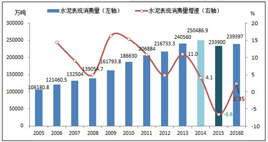 2016年全國(guó)水泥表觀消費(fèi)量及增速預(yù)估
