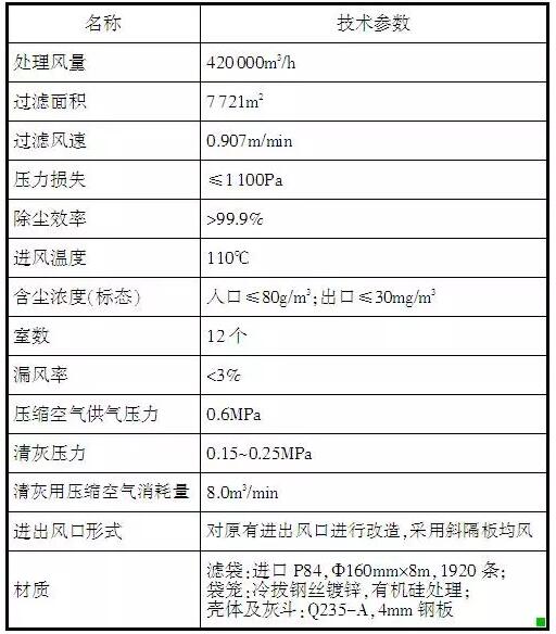 改造后袋除塵系統(tǒng)技術(shù)要求:處理風(fēng)量≥420000m3/h;標(biāo)態(tài)下出口濃度≤30mg/m3;標(biāo)態(tài)下壓縮空氣≤4m3/min;阻力≤1300Pa。