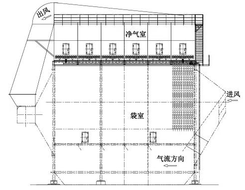 根據(jù)參數(shù)要求,窯尾除塵器電改袋時(shí),原有電除塵器空間緊湊,水平截面較小,且寬度也較窄。風(fēng)量提高后,若按照常規(guī)的袋除塵器改造方式,需在設(shè)備殼體內(nèi)部設(shè)置出風(fēng)風(fēng)道,這樣要使改造后的袋除塵器滿足合理的過濾參數(shù),就會(huì)使濾袋間距很小,出風(fēng)風(fēng)道也較窄,這給整個(gè)收塵系統(tǒng)的穩(wěn)定低阻工作帶來很多不穩(wěn)定因素。