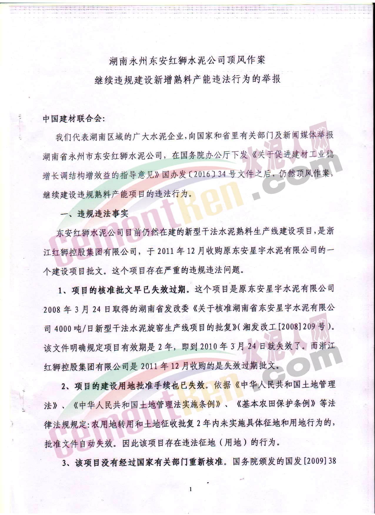水泥產(chǎn)能嚴(yán)重過剩已是中國水泥行業(yè)不爭的事實。盡管中央三令五申“嚴(yán)禁建設(shè)新增產(chǎn)能項目”,但依舊有部分水泥企業(yè)屢次越界,觸碰產(chǎn)能紅線。近日,有人向水泥人網(wǎng)爆料,湖南永州東安紅獅水泥公司頂風(fēng)作案,繼續(xù)違規(guī)建設(shè)新增熟料產(chǎn)能。舉報材料如下: