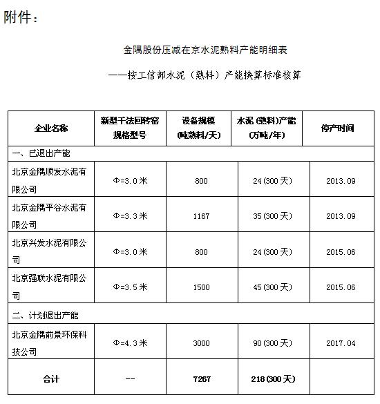 根據(jù)北京市疏解非首都核心功能的工作要求,為進(jìn)一步加快公司產(chǎn)業(yè)結(jié)構(gòu)轉(zhuǎn)型升級(jí),金隅股份計(jì)劃于2017年4月再關(guān)停退出北京前景環(huán)保科技有限公司1條水泥回轉(zhuǎn)窯生產(chǎn)線,該條回轉(zhuǎn)窯產(chǎn)能指標(biāo)為3000噸熟料/天,折合90萬噸熟料/年。