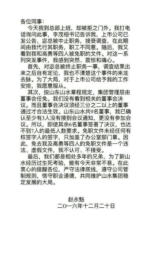 天瑞集團(tuán)控股山水水泥后,新山水水泥明顯出現(xiàn)了以老一派維權(quán)宓敬田為代表的派系與以天瑞高管為代表的山水水泥“新董事會(huì)”的爭(zhēng)斗,其內(nèi)部派系爭(zhēng)斗非常強(qiáng)烈。去年12月19日山水水泥上市公司發(fā)出公告,宓敬田因言論失職暫時(shí)免職,由趙永魁代其職,然而該公告很快又被撤銷,取而代之的是一份對(duì)趙永魁、高勇、劉德權(quán)、趙彬的免職文件,免職理由是嚴(yán)重違反集團(tuán)基本政治紀(jì)律,破壞山水集團(tuán)穩(wěn)定發(fā)展的大局,影響惡劣。