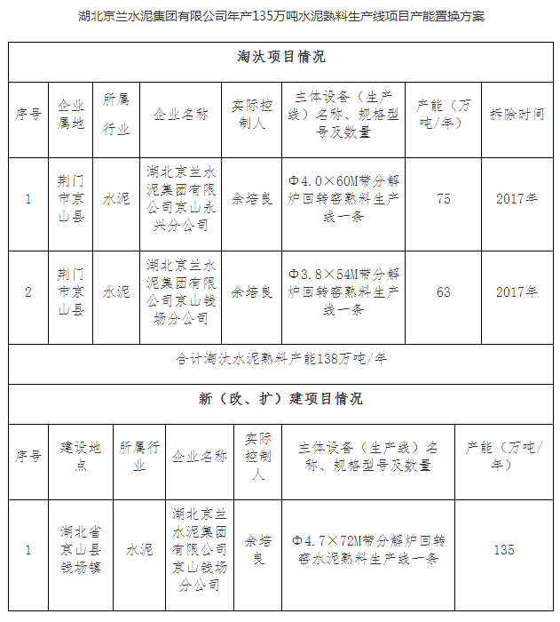 附:湖北京蘭水泥集團(tuán)有限公司年產(chǎn)135萬噸水泥熟料生產(chǎn)線項(xiàng)目產(chǎn)能置換方案