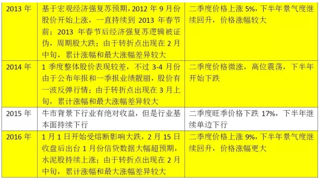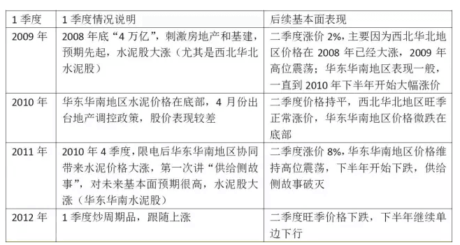 單看水泥股,是否也存在春季躁動(dòng)?我們選取了2009年以來的數(shù)據(jù),分別用季度累計(jì)漲幅和季度內(nèi)最大漲幅兩個(gè)指標(biāo)來衡量;結(jié)論還是比較清晰:一方面,大部分年份1季度都是正收益(出現(xiàn)負(fù)收益的年份特征都很明顯,下文會(huì)說明),而且如果擇時(shí)得當(dāng),會(huì)有不錯(cuò)斬獲(最大漲幅都比較大);另一方面,大部分年份,1季度的“最大漲幅”都大于其他三個(gè)季度,顯示出躁動(dòng)性。
