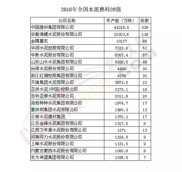 權(quán)威發(fā)布:2016年全國水泥熟料企業(yè)20強(qiáng)名單公布