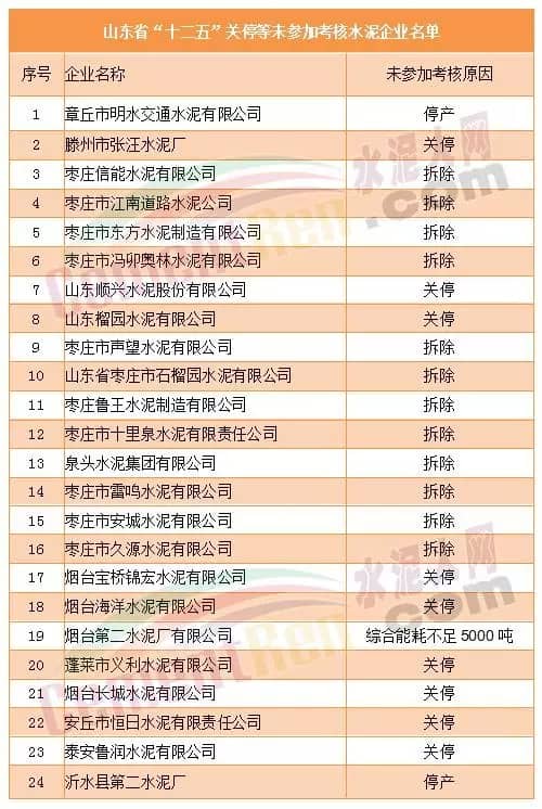 據(jù)統(tǒng)計(jì),“十二五”山東省列入國(guó)家萬(wàn)家企業(yè)節(jié)能低碳行動(dòng)的水泥企業(yè)總共74家,除24家因關(guān)停等原因未考核外,實(shí)際考核50家。其中,超額完成31家,占62%;完成19家,占38%。24家未考核的水泥企業(yè),原因有停產(chǎn)、關(guān)停、拆除、產(chǎn)能不足等,其中停產(chǎn)2家,占8.3%;關(guān)停9家,占37.5%;拆除12家,占50%;綜合能耗不足5000噸1家,占4.2%;關(guān)停企業(yè)名單列表如下: