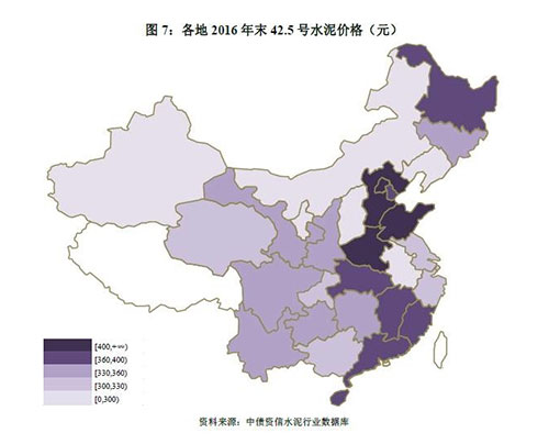華北地區(qū)由于基數(shù)較低,得益于京津冀地區(qū)需求回暖、金隅冀東整合帶來競(jìng)爭(zhēng)秩序改善等因素,全年42.5號(hào)水泥價(jià)格漲幅117元,居全國(guó)首位,價(jià)格水平亦從2015年末全國(guó)末尾攀升至第二位;東北地區(qū)往年在黑龍江、吉林良好競(jìng)爭(zhēng)秩序支撐下價(jià)格處全國(guó)高位,但2016年在需求低迷背景下價(jià)格漲幅較小,截至2016年末價(jià)格已處倒數(shù)第二位。