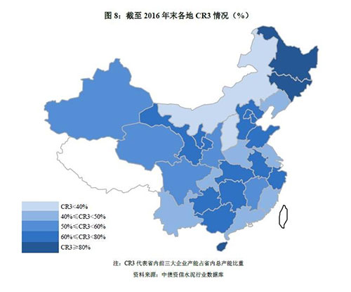 分區(qū)域看,兩湖、長(zhǎng)三角等地區(qū)較好的競(jìng)爭(zhēng)秩序和主導(dǎo)企業(yè)間相對(duì)成熟的競(jìng)爭(zhēng)策略利于區(qū)域價(jià)格維持合理水平;東北地區(qū)黑吉兩省集中度雖較高,但脫離需求基礎(chǔ)的協(xié)同效果已逐漸趨弱,正如上文所提,2016年?yáng)|北地區(qū)水泥價(jià)格漲幅全國(guó)墊底;山西和內(nèi)蒙是全國(guó)水泥區(qū)域產(chǎn)能集中度最低的兩個(gè)省份,區(qū)域內(nèi)尚未形成具有明顯優(yōu)勢(shì)的龍頭企業(yè),低迷的需求疊加較差的競(jìng)爭(zhēng)秩序?qū)ξ磥?lái)區(qū)域價(jià)格走勢(shì)形成制約。