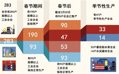 截至2月20日,巴彥淖爾市全市規(guī)模以上工業(yè)企業(yè)放假停產(chǎn)已復(fù)產(chǎn)的有90戶企業(yè),如剔除47戶季節(jié)性生產(chǎn)企業(yè)(33戶番茄脫水菜企業(yè)、14戶水泥建材企業(yè)),開工率達(dá)到81.3%,同比增長(zhǎng)10.2個(gè)百分點(diǎn)。