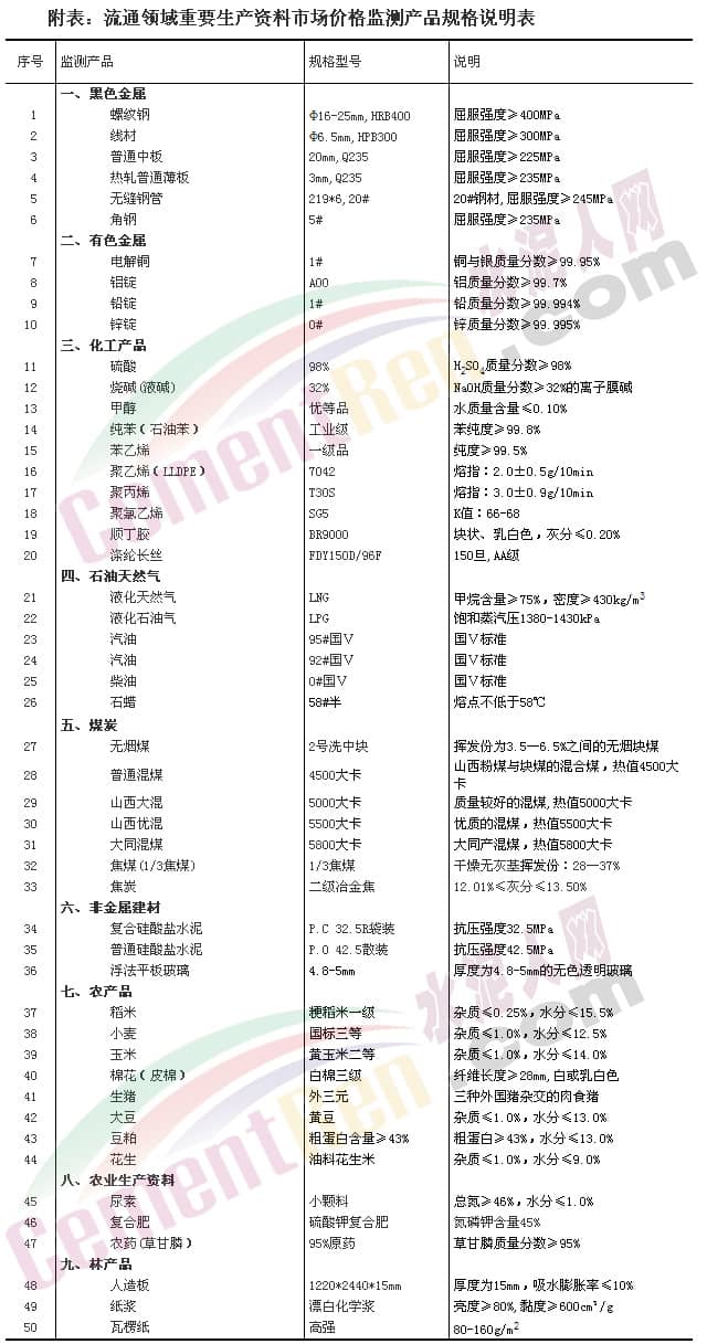 流通領域重要生產(chǎn)資料市場價格監(jiān)測內(nèi)容包括9大類50種產(chǎn)品的價格。類別與產(chǎn)品規(guī)格說明詳見附表。