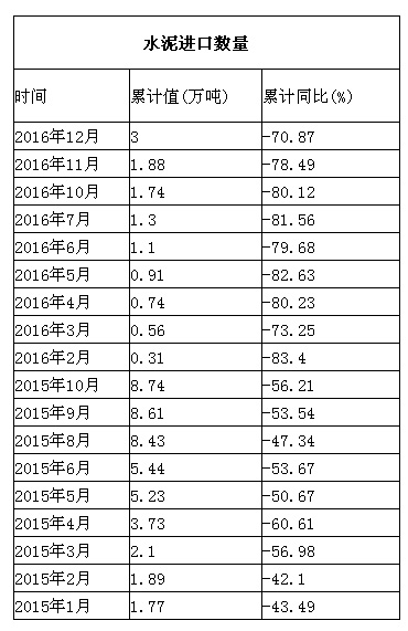 相關(guān)數(shù)據(jù)庫(kù)數(shù)據(jù)顯示,2016年我國(guó)水泥進(jìn)口數(shù)量累計(jì)3萬(wàn)噸,累計(jì)同比下降70.87%,進(jìn)口量持續(xù)大幅下跌,也進(jìn)一步反映了國(guó)內(nèi)水泥產(chǎn)能過剩矛盾突出問題。