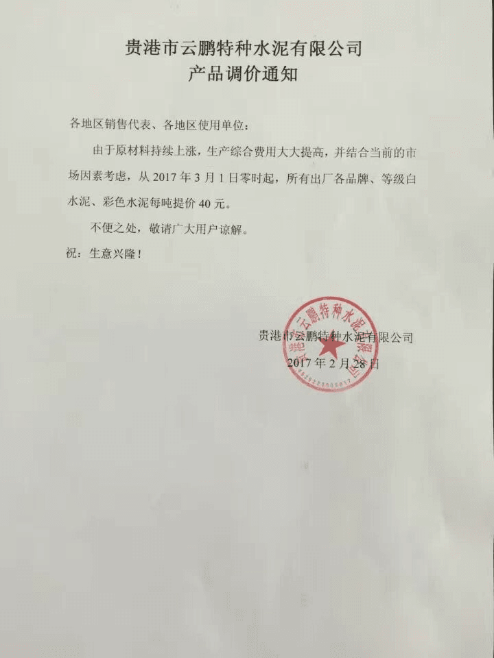 2月28日,貴港市云鵬特種水泥有限公司發(fā)布產(chǎn)品調(diào)價(jià)通知: