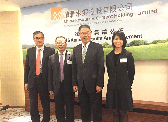 圖左起:華潤水泥執(zhí)行董事及首席財務(wù)官劉忠國、執(zhí)行董事及總裁紀(jì)友紅、主席及執(zhí)行董事周龍山、投資者關(guān)系部總經(jīng)理林虹