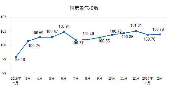 2月份,房地產(chǎn)開發(fā)景氣指數(shù)(簡(jiǎn)稱“國(guó)房景氣指數(shù)”,今年起發(fā)布的是基期修定后的值)為100.78,比1月份提高0.02點(diǎn)。