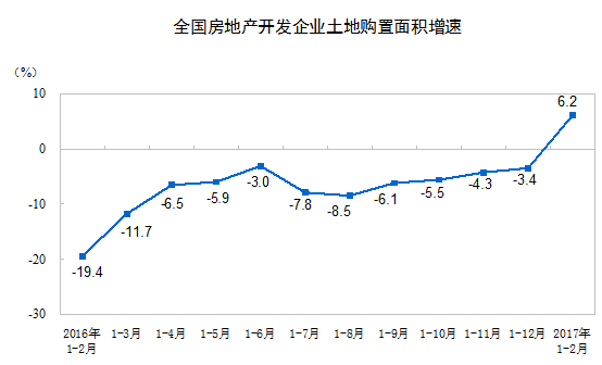 1-2月份,房地產(chǎn)開發(fā)企業(yè)土地購(gòu)置面積2374萬(wàn)平方米,同比增長(zhǎng)6.2%,去年全年為下降3.4%;土地成交價(jià)款794億元,增長(zhǎng)12.7%,增速回落7.1個(gè)百分點(diǎn)。