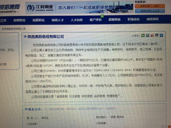 行業(yè)網(wǎng)站“線纜招聘網(wǎng)”上的一則招聘信息稱,陜西奧凱公司的前身是西安奧凱公司。