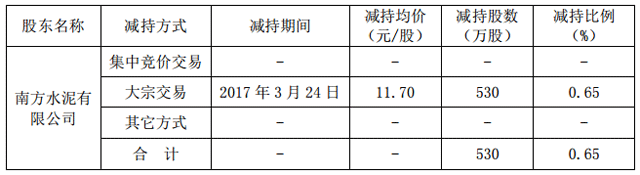 南方水泥自 2016 年 12 月 13 日至 2017 年 3 月 24 日期間通過大宗交易方式累計(jì)減持 59,980,900 股,減持股份比例占公司總股本的 7.37%。自最近一次披露權(quán)益變動(dòng)報(bào)告書起至本次減持后,南方水泥累計(jì)減持公司股份 19,300,000 股,占公司總股本的 2.37%。
