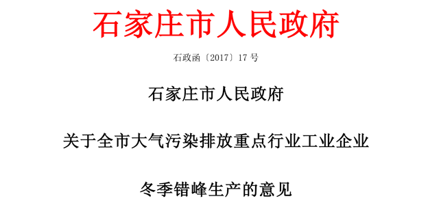 河北省石家莊市政府日前出臺(tái)《關(guān)于全市大氣污染物排放重點(diǎn)行業(yè)工業(yè)企業(yè)冬季錯(cuò)峰生產(chǎn)的意見》(以下簡(jiǎn)稱《意見》)。