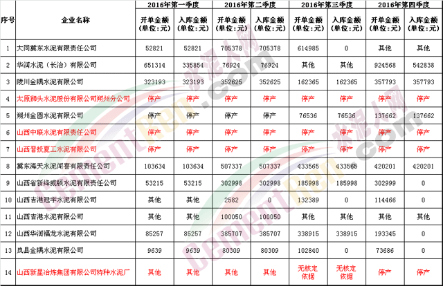 山西省2016年國(guó)家重點(diǎn)監(jiān)控企業(yè)排污費(fèi)征收情況及2016年國(guó)控企業(yè)欠繳情況公告顯示,2016年全年共有14家水泥企業(yè)列入國(guó)家重點(diǎn)監(jiān)控企業(yè)名錄,其中除太原獅頭水泥股份有限公司朔州分公司、山西中聯(lián)水泥有限責(zé)任公司、山西晉投夏工水泥有限公司3家企業(yè)全年停產(chǎn),山西新星冶煉集團(tuán)有限公司特種水泥廠全年不涉及 其余10家均有交納排污費(fèi)。