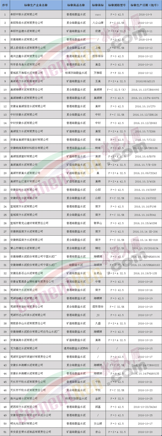 安徽省質(zhì)監(jiān)局官網(wǎng)近日公布了2016年水泥產(chǎn)品省級(jí) 監(jiān)督抽查結(jié)果,在全省7個(gè)地市(合肥、蕪湖、宣城、滁州、阜陽、黃山、亳州)的水泥產(chǎn)品生產(chǎn)領(lǐng)域內(nèi)共抽取51組水泥樣品,51組水泥產(chǎn)品綜合判定結(jié)論均為合格,抽檢合格率為100%。