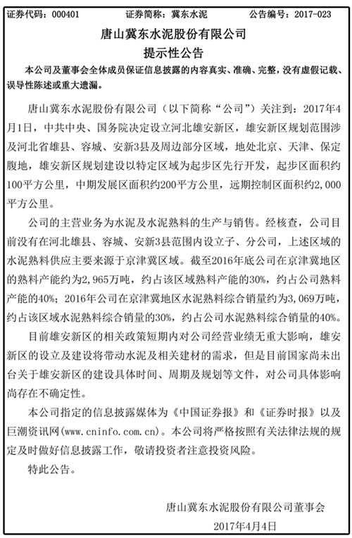 冀東水泥回應:公司在京津冀區(qū)域水泥銷售價格上漲,對公司利潤影響暫無法做定量判斷,但有一定正向影響;因目前國家尚未出臺關(guān)于雄安新區(qū)的建設(shè)具體時間、周期及規(guī)劃等文件,對公司具體影響尚存在不確定性;公司目前沒有在河北雄縣、容城、安新3縣范圍內(nèi)設(shè)立子、分公司。