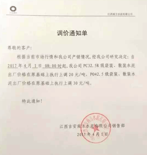 圖:江西吉安南方水泥調(diào)價(jià)函
