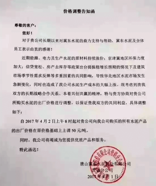 圖:唐山冀東水泥調(diào)價(jià)函