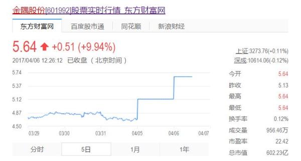 自4月1日雄安新區(qū)設(shè)立的消息發(fā)布以來,被稱為雄安概念股的北京金隅股份有限公司(601992.SH,02009.HK)表現(xiàn)搶眼,A股延續(xù)連日漲停的態(tài)勢,H股在短短兩個交易日累計上漲49%,不過H股在今天開盤后出現(xiàn)下跌。截至發(fā)稿,金隅A股報5.64元/股,漲停;金隅H股報4.49港元/股,跌幅6.65%。