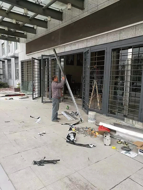 4月10日,工人正在對損壞的大門進(jìn)行修復(fù)