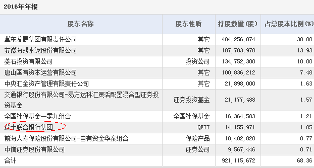 相關(guān)數(shù)據(jù)顯示,2016年年報中瑞銀集團(tuán)(UBS)位列該股第八大流通股股東,持有14,155,971股,占總股本比例1.05%。
