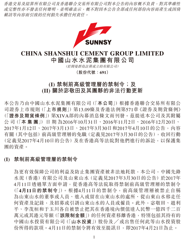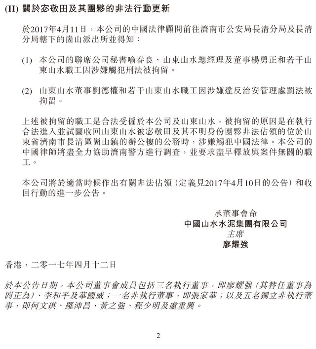 (1) 公司的聯(lián)席公司秘書喻春良、山東山水總經(jīng)理及董事楊勇正和若干山東山水職工因涉嫌觸犯刑法被拘留。