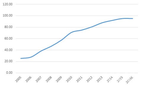 根據(jù)國家統(tǒng)計局數(shù)據(jù),2015年窯外分解窯熟料產(chǎn)量達12.7億噸,占熟料總產(chǎn)量的95.18%,預計2016年這一比重在95.2%左右,基本與2015年相當。雖然窯外分解窯工藝的熟料產(chǎn)量比重逐年提高,但是截止2016年仍有4.8%的熟料由非窯外分解窯生產(chǎn)。