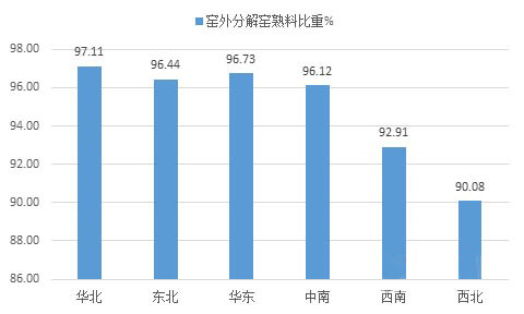分區(qū)域來看,華北、東北、華東、中南四大區(qū)域窯外分解窯熟料產(chǎn)量占比均超過96%,西北及西南地區(qū)這比比例較其他區(qū)域則略低,分別為93%和90%,西北地區(qū)非窯外分解窯熟料產(chǎn)量的比重接近10%。