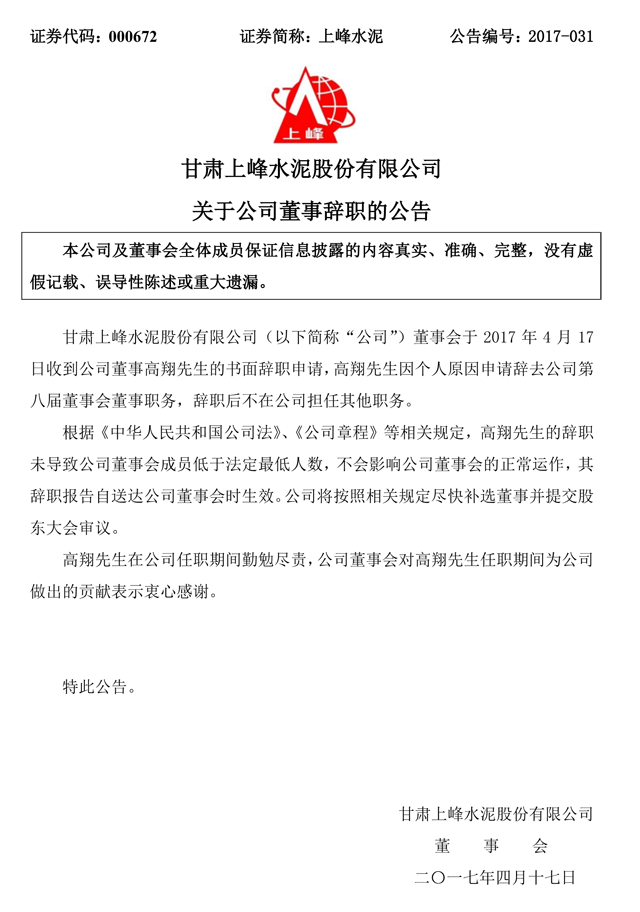 上峰水泥4月17日發(fā)布晚間公告稱,董事會(huì)收到公司董事高翔先生的書面辭職申請,高翔先生因個(gè)人原因申請辭去公司第八屆董事會(huì)董事職務(wù),辭職后不在公司擔(dān)任其他職務(wù)。