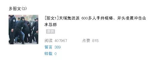 日前,水泥人網(wǎng)發(fā)布了一篇《天瑞集團(tuán)派 600多人手持棍棒、斧頭凌晨沖擊山水總部》的文稿。該事件引起了社會(huì)各界的強(qiáng)烈關(guān)注,截止目前,閱讀量已經(jīng)超過(guò)40萬(wàn)。以下為后臺(tái)截圖: