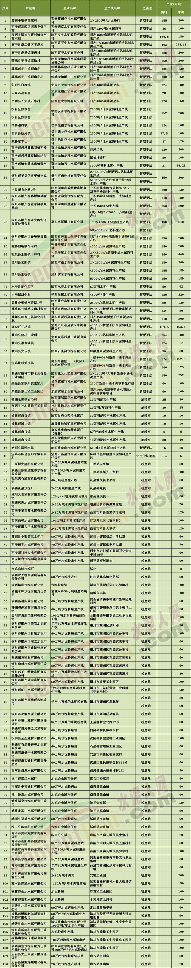 陜西省水泥企業(yè)清單