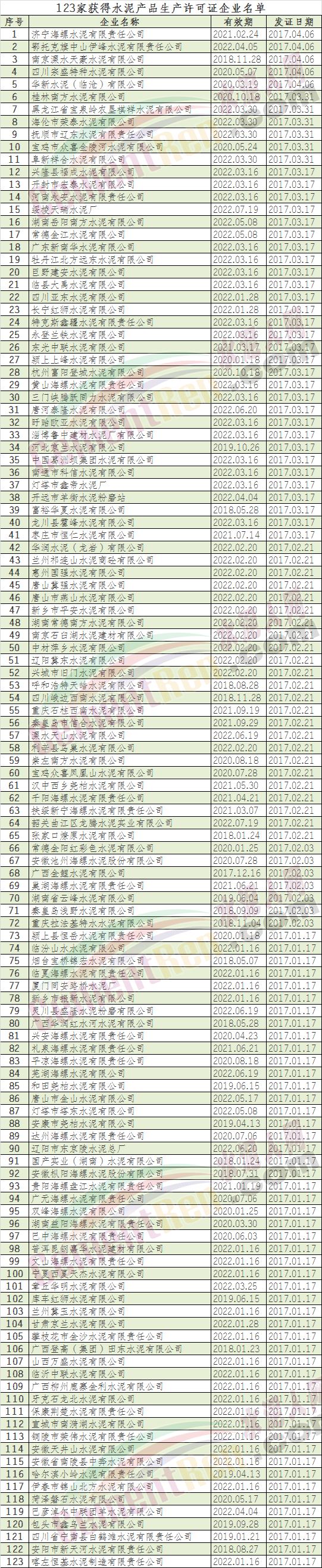 質(zhì)監(jiān)總局首批取得生產(chǎn)許可證的123家水泥企業(yè)名單