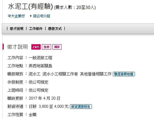 根據(jù)《中央社》報導(dǎo),征人的業(yè)者李先生說,關(guān)島當(dāng)?shù)赜袀€大學(xué)的新建大樓工程需要工人,因此想從臺灣招募工人過去,將應(yīng)征有經(jīng)驗的水泥工20至30人。臺灣的水泥師傅日薪約在2000~3000元,一個月約賺6至7萬。