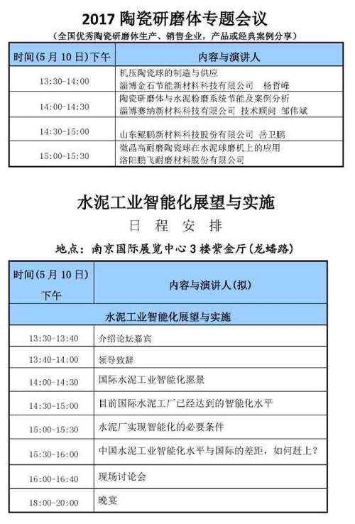 2017年陶瓷研磨體專題會(huì)議,即全國優(yōu)秀陶瓷研磨體生產(chǎn)、銷售企業(yè)產(chǎn)品或經(jīng)典案例分享 將于5月10日下午舉行。同期,水泥工業(yè)智能化展望與實(shí)施將于5月10日下午在南京國際展覽中心3樓紫金廳進(jìn)行。具體安排如下: