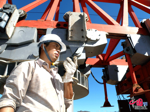寬扎河特大橋施工現(xiàn)場,中國工人指揮大型架橋機操作