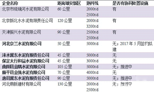 表:距離雄安新區(qū)150公里以內(nèi)的有窯水泥廠(特種水泥廠除外)