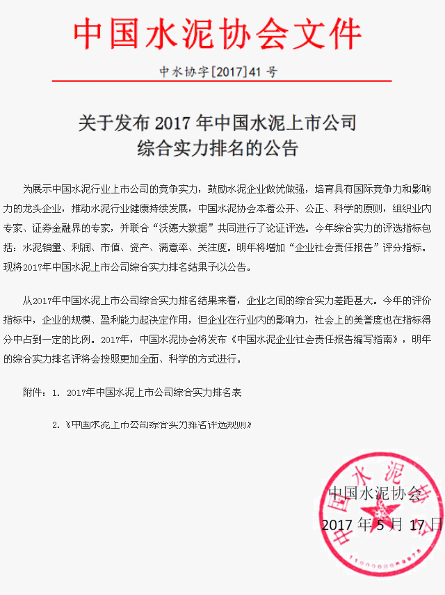 關(guān)于發(fā)布2017年中國水泥上市公司綜合實力排名的公告