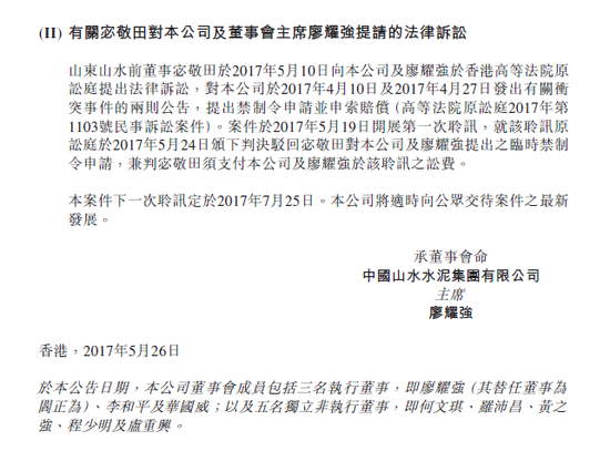 公告指出,山東山水董事、總經(jīng)理楊勇正和本公司聯(lián)席公司秘書、山東山水總經(jīng)理助理喻春良是本集團的高管并依法執(zhí)行于山東山水總部的接管收回行動。宓敬田對本公司及董事會主席廖耀強提請的法律訴訟,本案件下一次聆訊定于2017年7月25日。