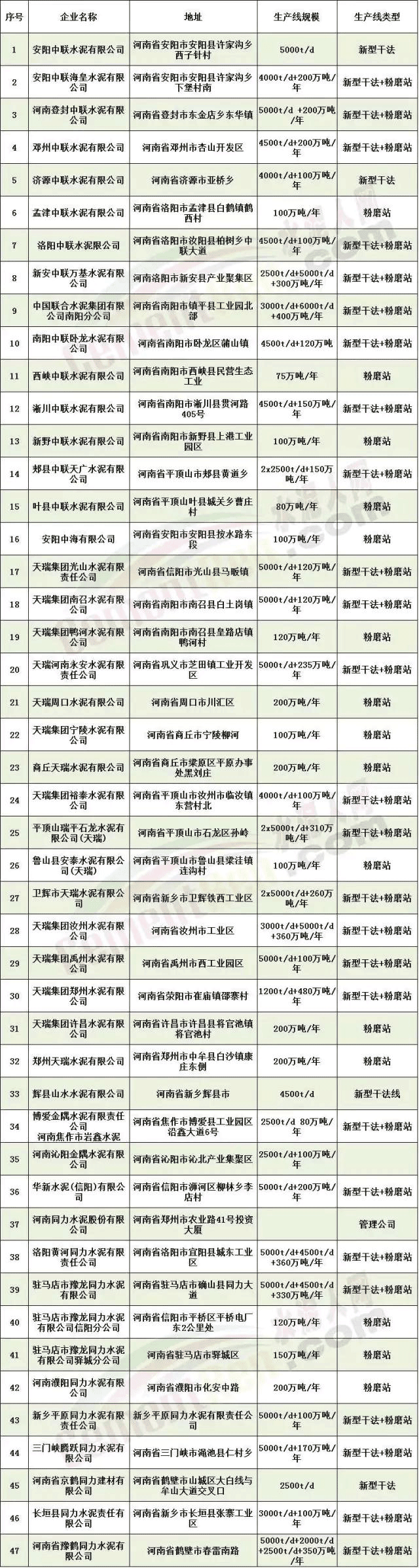 據(jù)相關(guān)數(shù)據(jù)統(tǒng)計(jì)河南省轄區(qū)內(nèi)水泥企業(yè)有50余家,涉及前20強(qiáng)水泥龍頭企業(yè)的熟料生產(chǎn)線40多條。其中包括中國聯(lián)合水泥14條熟料生產(chǎn)線,天瑞集團(tuán)12條水泥熟料生產(chǎn)線以及同力水泥的11條水泥熟料生產(chǎn)線,也包括華新水泥、山水水泥、金隅水泥等水泥龍頭企業(yè)的水泥熟料生產(chǎn)線。