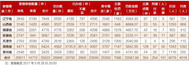 截至2017年5月28日20:00,共計受理舉報35523個(其中,來電舉報20811個,來信舉報14712個);經(jīng)梳理分析并合并重復舉報,累計向被督察地方交辦有效舉報28966件。地方已辦結23599件,責令整改20359家,立案處罰7086家,共計罰款33587.86萬元;立案偵查354件,行政和刑事拘留355人,約談6079人,問責4018人(具體情況詳見附表)。