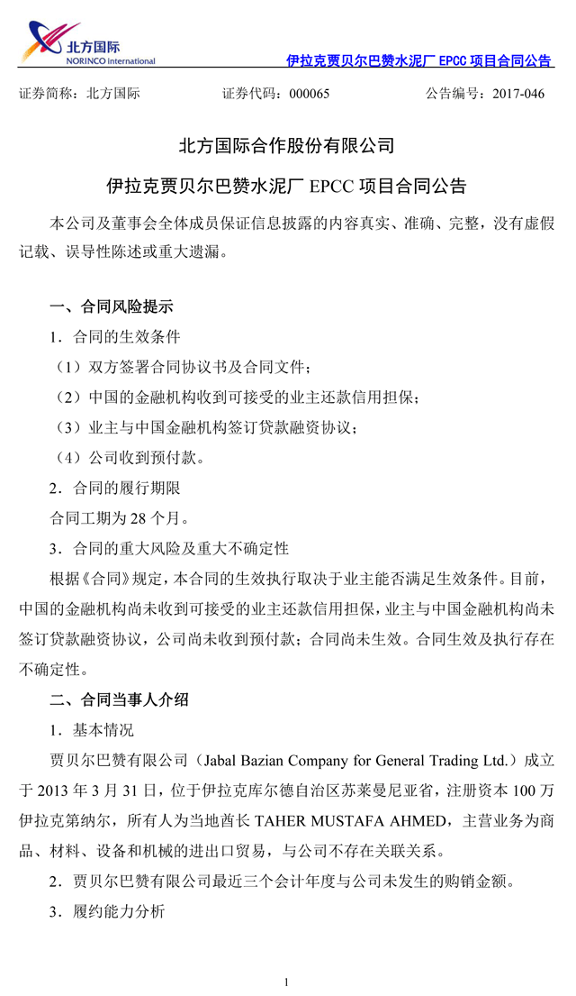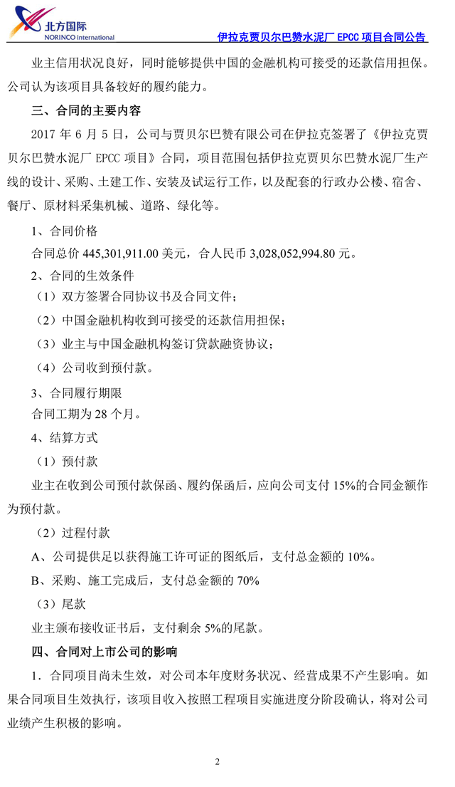 2017年6月5日,北方國際與賈貝爾巴贊有限公司在伊拉克簽署合同,項(xiàng)目范圍包括伊拉克賈貝爾巴贊水泥廠生產(chǎn)線的設(shè)計(jì)、采購、土建工作、安裝及試運(yùn)行工作,以及配套的行政辦公樓、宿舍、餐廳、原材料采集機(jī)械、道路、綠化等。合同總價(jià)445,301,911.00美元,合人民幣3,028,052,994.80元。