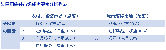 一個好的競爭戰(zhàn)略是以客戶群體(市場細(xì)分)為基礎(chǔ)的,策略制定人員必須對不同客戶群體需求特征有深刻了解??梢钥紤]按特定相關(guān)客戶(細(xì)分市場)需求特點,分別考慮。譬如民用市場、工業(yè)市場是兩個基本的市場細(xì)分類型,在民用市場下面,還可以繼續(xù)細(xì)分為農(nóng)村城鎮(zhèn)市場與城市裝修市場,工業(yè)市場也可以細(xì)分為性能驅(qū)動型、價格驅(qū)動型與關(guān)系驅(qū)動型。在這眾多的客戶類型中,客戶的需求特征是不一樣的,企業(yè)成功要素理所當(dāng)然不一樣。舉例說明水泥企業(yè)民用市場成功要素分析如下:
