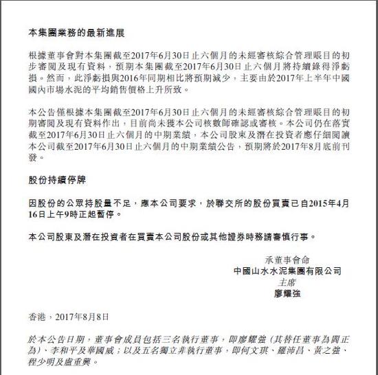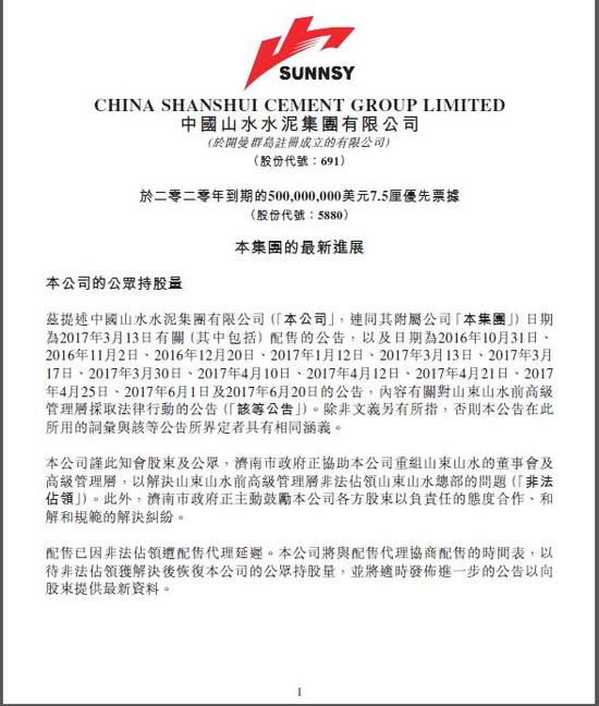 山水水泥(00691)8月8日晚間披露公司最新進展,濟南市政府正協(xié)助公司重組山東山水的董事會及管理層,以解決山東山水前高級管理層非法占領山東山水總部的問題。此外,濟南市政府正主動鼓勵公司各方股東以負責任的態(tài)度解決糾紛。